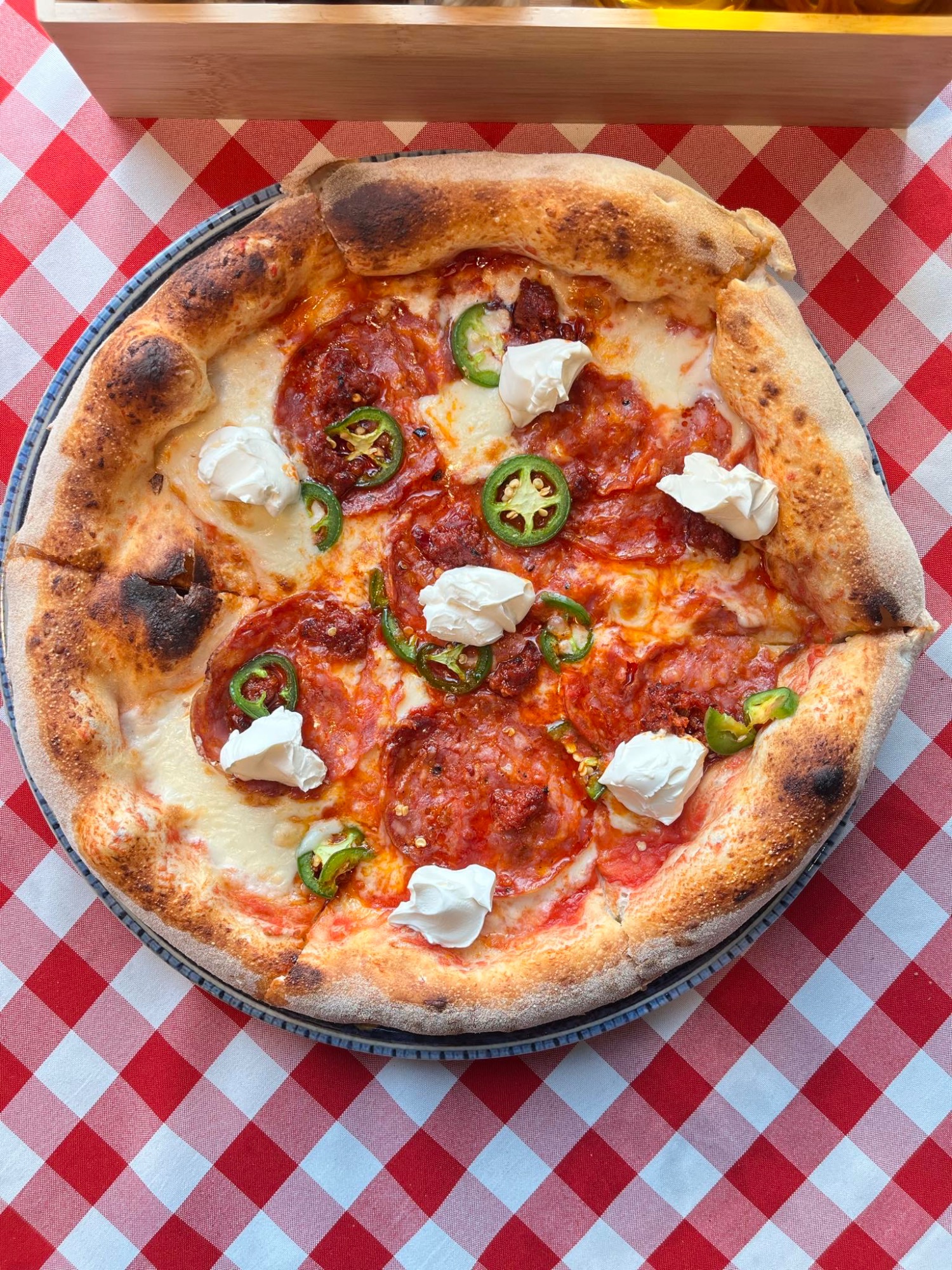 sos ostry, wołowina Angus, bułka wypiekana w naszym piecu,chips z boczku, ser cheddar, mix sałat, pomidor, ogórek, cebula, jalapenio